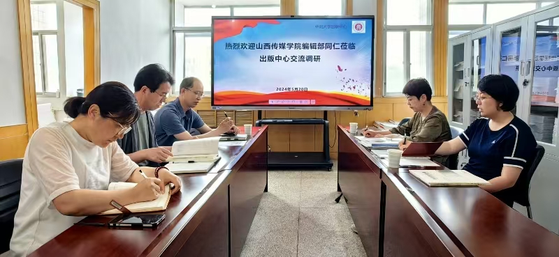 5 月 20 日下午,山西传媒学院学报编辑部周怡帆副主任和赵文丽老师到访中北大学出版中心,就双方单位之间“加强学术交流与合作,推动期刊高质量发展”进行交流。出版中心主任李迎春教授对周怡帆主任一行表示热烈欢迎,温新瑞、王永莲和刘幼立三位编辑参加了本次交流会。