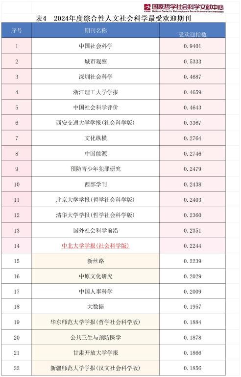 该报告对我国606种综合性人文社会科学期刊的阅读指数、下载指数与受欢迎指数进行计算统计,并按照受欢迎指数排序后,展示前10%的61种综合性人文社会科学最受欢迎期刊,《中北大学学报(社会科学版)》排在第14名,受欢迎指数为:0.2244。