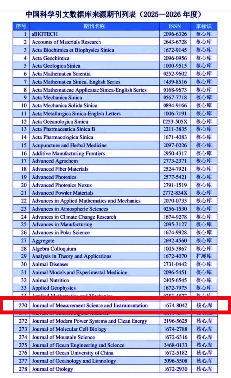 近日,中国科学院文献情报中心发布了中国科学引文数据库(Chinese Science Citation Database, CSCD) 2025-2026年来源期刊遴选结果, 共收录来源期刊1464种,其中核心库1098种,扩展库366种(418种英文期刊,1046种中文期刊)。我校主办的《测试科学与仪器(英文)》再次入选CSCD核心库。