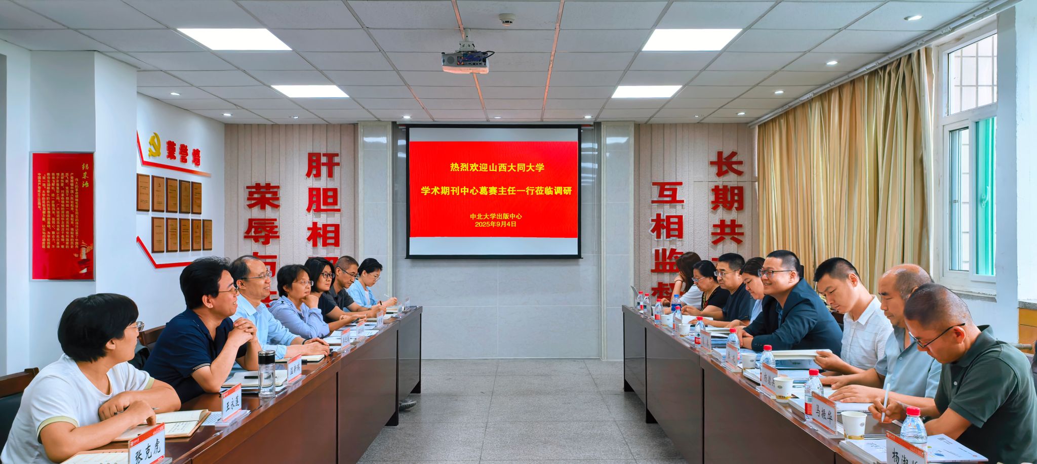 2025年9月4日下午,山西大同大学学术期刊中心主任葛赛、副主任张晓等一行10人到访出版中心,就期刊制度建设、编辑队伍培养、约稿机制、专家库运维及新媒体数字化转型等方面进行交流调研。出版中心主任李迎春教授对葛赛主任一行的到来表示热烈欢迎,出版中心全体职工参加了本次交流会。