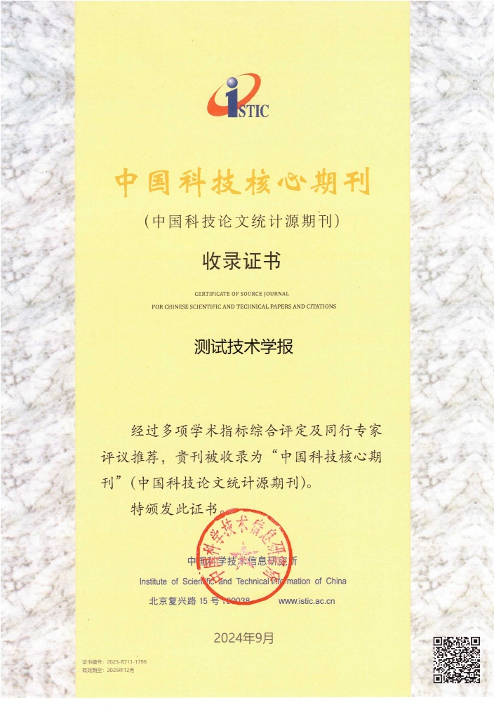2024年9月20日,中国科学技术信息研究所在北京召开了本年度“中国科技论文统计报告发布会暨中国一流科技论文世界影响力评价论坛”,并发布了《2024年版中国科技期刊引证报告(核心版)》,《测试技术学报》继续被收录为“中国科技核心期刊”(中国科技论文统计源期刊)。